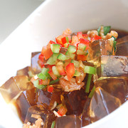 海凉粉、海米、青红椒、香菜、蒜米、老醋、盐、糖、味极鲜、香油。