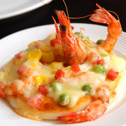 面粉、牛奶、盐、橄榄油、酵母、香肠丁、豌豆、玉米、鲜虾、表面刷的橄榄油、番茄酱。
