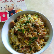 米饭、鸡蛋、小黄姜、瘦肉、香肠、葱、盐、酱油。