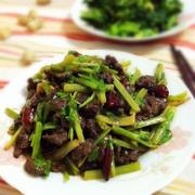 牛肉、香芹、干红辣椒、姜、酱油、盐、生粉、白酒、胡椒、黑胡椒、鸡精。