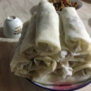 薄饼、韭菜、绿豆芽、肉丝、豆腐皮、盐。