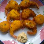 鲜虾、芝士片、淀粉、鸡蛋、面包糠、盐、黑胡椒。