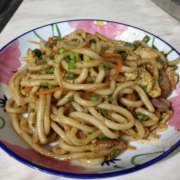 荞麦面、长茄子、洋葱、蒜、姜、淀粉、豆瓣酱、盐、糖、生抽、醋、辣椒粉。
