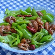 肥肠、青尖椒、食用油、食盐、白胡椒粉、料酒、酱油、蒜末、湿淀粉、葱姜丝、白糖。