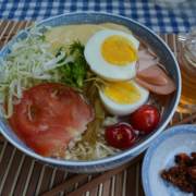 盛冈冷面、西红柿、白菜丝、黄瓜片、韩国泡菜、熟鸡蛋、香肠片、苹果片、韩国泡菜汁、韩国辣酱、白醋、白糖、食盐。