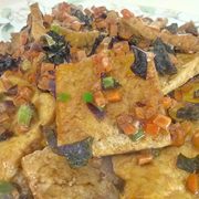 豆腐、胡萝卜、火腿肠、木耳、紫甘蓝、小葱、蒜、蚝油、甜面酱、盐。