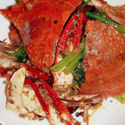 螃蟹、红黄彩椒、生姜、百梦多咖哩块、洋葱。