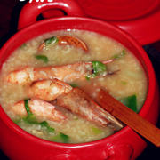 新鲜带骨鸡肉、大虾、大米适量、小白菜、盐、香油、鲜贝露、生姜丝、水。