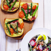 蒜薹、杏鲍菇、洋葱、小番茄、培根、芝士碎、吐司、黄油、黑胡椒、盐。