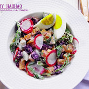 红薯、紫薯、苦菊、鸡蛋、红皮萝卜、沙拉酱、牛奶。