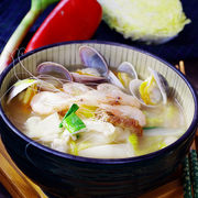 年糕、白菜、口蘑、小白虾、蛤蜊、猪肉、蒜苗、姜、鸡精、料酒、盐、清水。