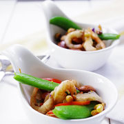 北极虾、口蘑、甜豆、松子、美国大杏仁、开心果、红椒、紫甘蓝、料酒、盐、橄榄油、香油、鸡精、白糖。
