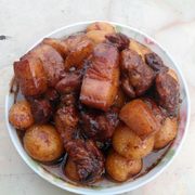 五花肉、小土豆、啤酒、盐、酱油、鸡精、白糖。