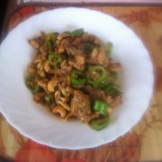 鸡腿肉、青辣椒、腰果、葱白、蒜。