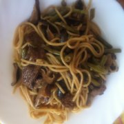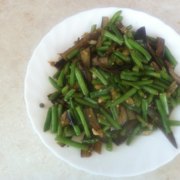豆角、牛肉、意大利面、蒜、香菇、生抽、老抽、醋、盐、糖。