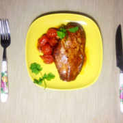 鸡胸肉、小蕃茄、蒜、红酒、米醋、糖、罗勒叶、番茄酱、盐、胡椒粉、黄油、橄榄油、高汤。