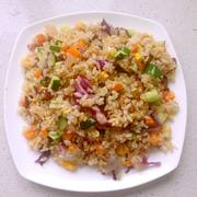 米饭、胡萝卜、柴鸡蛋、紫甘蓝、香葱、火腿肠、油、盐、鸡精、生抽。