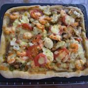面粉、发酵粉、小西红柿、洋葱、花菜、大鸡腿、白蘑菇、基围虾、黄油、马苏里拉奶酪。