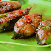 马鲛鱼、姜、香菜、小青椒、小红椒、生抽、胡椒粉、盐、白糖。