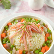 高汤、米饭、胡萝卜、洋葱、豌豆、火腿片。