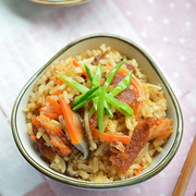 米饭、鳗鱼罐头、香菇、胡萝卜、荷兰豆、姜丝、生抽。