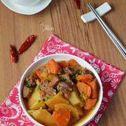 牛腩、胡萝卜、土豆、生抽、老抽、料酒、花椒、八角、桂皮、香叶、姜蒜。
