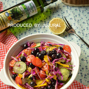 橄榄油、紫椰菜、黄椒、黄瓜、小番茄、蓝莓、柠檬汁、黑胡椒粉。