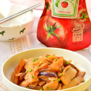 茄子、肉丝、亨氏番茄酱、葱、姜、生抽。