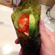牛油果、海苔、熟米饭、虾仁、鱼籽、球生菜。