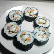 米饭、紫菜、胡萝卜、黄瓜、鸡蛋、火腿肠、韩式辣酱、番茄酱、盐。