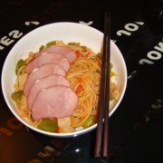 意大利面、猪肉、青椒、番茄、蒜泥、洋葱。