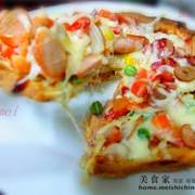 速溶酵母、温水、高筋面粉、盐、白糖、黄油、香肠、火腿、番茄、蟹柳、洋葱、马苏里奶酪、青红椒、杂锦豆、番茄酱、辣椒酱、黑胡椒酱、芝士。