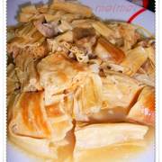 面条、鱼饼、姜、葱、蒜、肉片、包菜、鸡精粉、辣椒酱、番茄酱、糖。