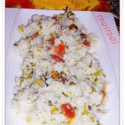 隔夜白饭、蒜、葱、葱段、鸡蛋、指天椒、麻辣酱、芫西、肉末、红萝卜丝。