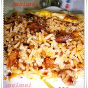 隔夜饭、肉末、腊肠、炸鸡块、姜、葱。