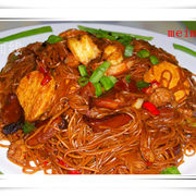 幼面线、虾仁 、猪肉碎、冬菇 、腊肠 、葱棵、鱼圆、指天椒、自制辣椒酱、葱粒、蒜、蚝油、酱油、 黑酱油、鸡精粉、香油。