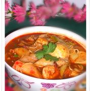 风干面、麻辣酱、白菜、芫茜、指天椒、胶鱼末、鱼圆、虾、蟹柳。