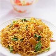 风干面、猪肉丸、鱼片、肉碎、蒜蓉、葱花、青菜、沙茶酱、老抽、酱油、水。