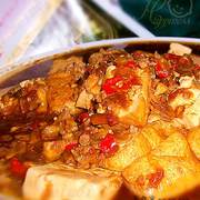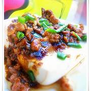嫩豆腐、肉碎、葱段、鲍鱼瑶池汁、沙茶酱、老抽、生粉、酒、生抽、鸡精。