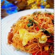 米粉、芫茜、胡萝卜、红辣椒、烧肉、鸡蛋、蒜米、小葱、姜、鸡精粉、老抽、酱油、胡椒粉、香油。
