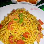 面条、泰式绿咖喱膏、香肠、火腿、长豆角、西芹、指天椒、小葱、蒜米。