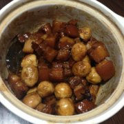 五花肉、鹌鹑蛋、葱姜、大料、桂皮、香叶、料酒、老抽、冰糖、盐。