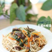 面条、小白菜、胡萝卜、牛肉、洋葱、蒜、沙茶酱、牛排酱、胡椒粉、盐、酱油、白糖。