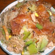 米面、青菜、豆腐干、猪肉、黄豆芽。