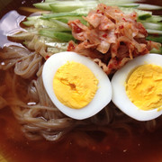 鸡蛋、冷面、黄瓜、泡菜、盐、糖、米醋、生抽、凉白开、蒜末、姜末。