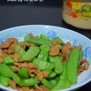 猪里脊肉、荷兰豆、大蒜、生抽、白糖、淀粉、料酒、鸡精、盐。