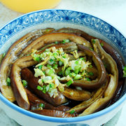 茄子、小葱、香醋、白糖、生抽、白醋、鸡精、香油、大蒜、姜、盐。