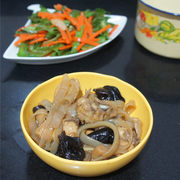 土鸡、粉条、干贝、黑木耳、香菇、料酒、生抽、老抽、白糖、蚝油、姜、盐、蒜。