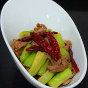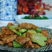 猪瘦肉、西兰花梗、植物油、生粉、生抽、老抽、料酒、白糖、大蒜、鸡精、盐。