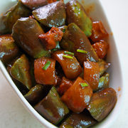 牛肉、茄子、小葱、生粉、老抽、生抽、料酒、番茄沙司、白糖、姜、蒜、盐。